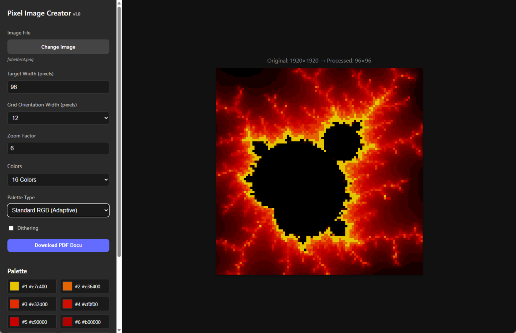 Using the app is straightforward and intentionally simple. First, you choose the basic image settings — such as the target image size and the number of colors. Once you’re happy with the result, you can download a PDF documentation.