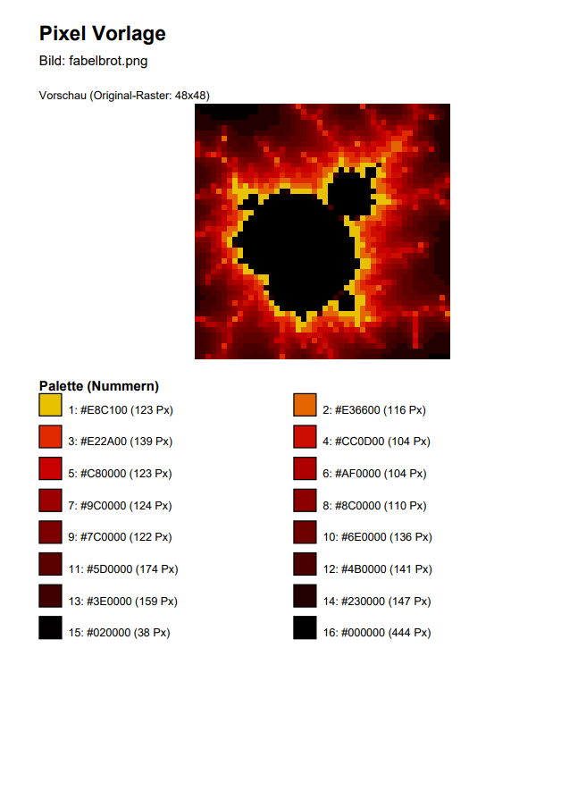 This PDF becomes your building guide: it starts with an overview of the pixelated image and its color palette: